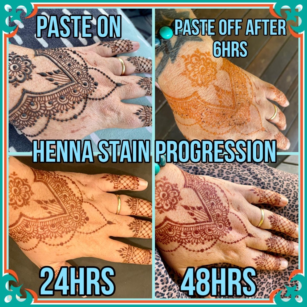 Remember, the intensity and duration of henna color can vary depending on factors like skin type, body location, and aftercare. Following these aftercare tips will help maximize the lifespan and vibrancy of your henna art.